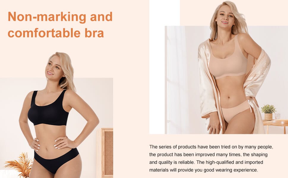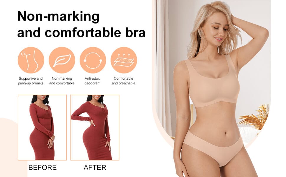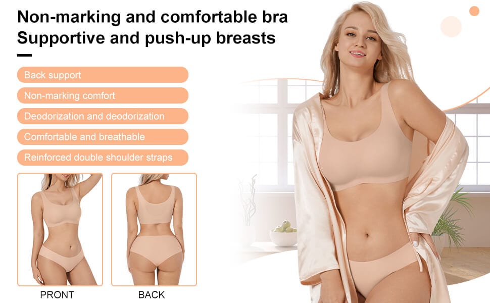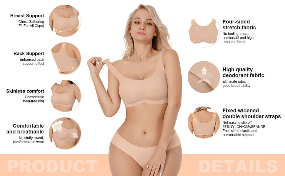 1. Support and push-up bra:The product uses a Japanese drop glue design instead of an underwire process to provide comfortable support. It also implements point structure support to create directional compression which is strongly supportive, not easy to move up, invisible, comfortable and senseless. The chest inner layer applies mesh fabric to increase the push-up effect; The use of X-shaped back dot glue design is to increase the back support and enhance the chest support effect.